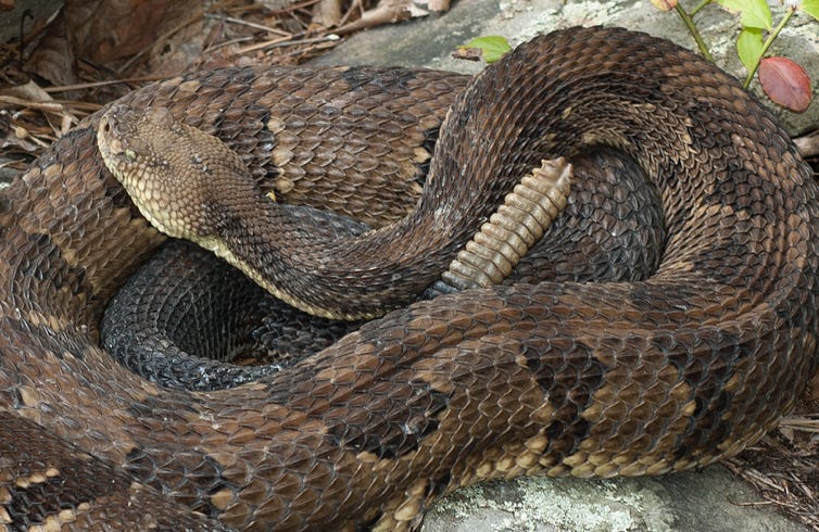 Milk snakes and garter snakes are often mistaken for timber rattlesnakes, even though they don't have rattles and are significantly smaller in size. Neither of them are venomous and are commonly found in neighborhood backyards.