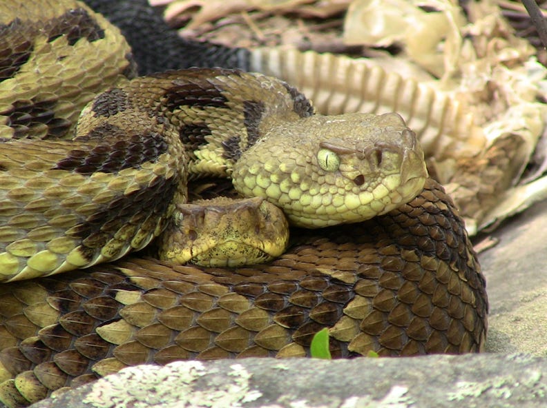 Timber Rattlesnake bites are very rare. However, if you are bitten, do not attempt to treat the bite site yourself. Seek medical attention as soon as possible.